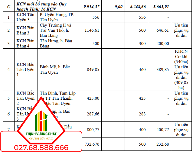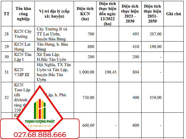 Khoảng 2.906 ha diện tích KCN có trong quy hoạch quốc gia, đang và chuẩn bị đầu tư bao gồm 06 dự án KCN chuyển sang từ quy hoạch trước đây (công văn số 173/TTg-KTN 2016) gồm KCN Cây Trường, KCN VSIP III, KCN Tân Lập I, KCN Lai Hưng, KCN Tam Lập, KCN Bình Dương Riverside ISC. Cụ thể: