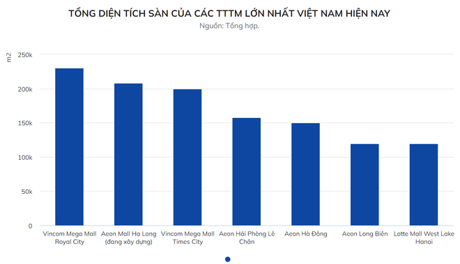 Trong lúc này, cuộc chơi TTTM vẫn nằm trong tay hàng loạt tên tuổi lớn. Dự án có tổng diện tích sàn lớn nhất hiện nay được cho là Vincom Mega Mall Royal City (Hà Nội) với tổng cộng 230.000 m2 sàn cho thuê. Kế đến là Vincom Mega Mall Times City (Hà Nội) có tổng diện tích hơn 200.000 m2.
